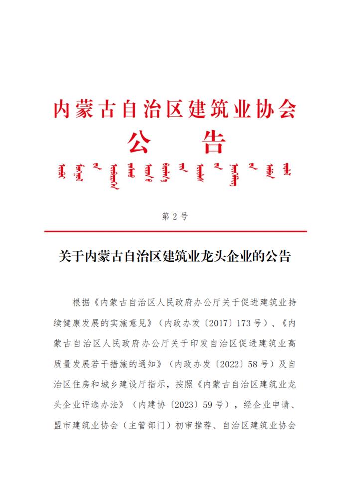 赤峰添柱建筑工程有限公司荣获内蒙古自治区建筑业龙头企业称号